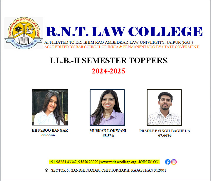 RNT Law College, Chittorgarh is a premier institution dedicated to providing quality legal education and fostering academic excellence. Affiliated with Dr. Bhimrao Ambedkar Law University, Jaipur, Rajasthan—a NAAC Accredited ‘A’ Grade University—the college is approved by the Bar Council of India and holds a Permanent NOC from the State Government.